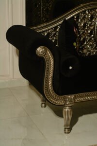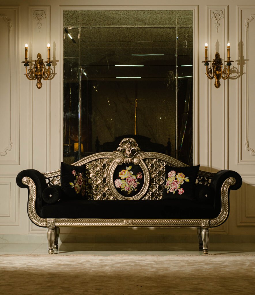 Give a glam factor to your drawing room with our Majestic Deewan. This beauty is built in solid wood with detail carving in sliver antique finish. This will help define your space.