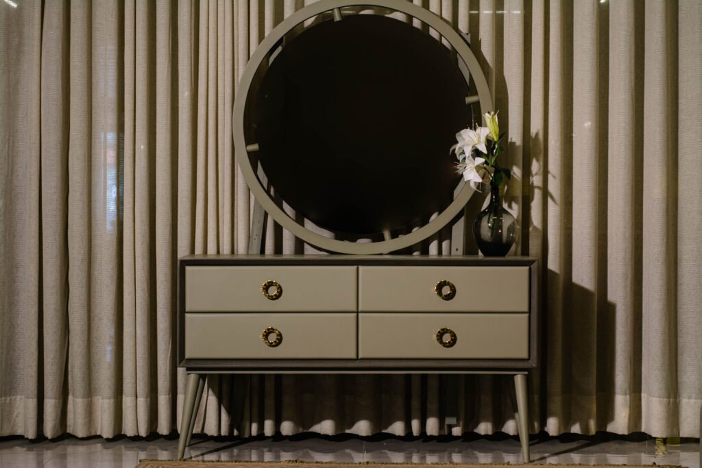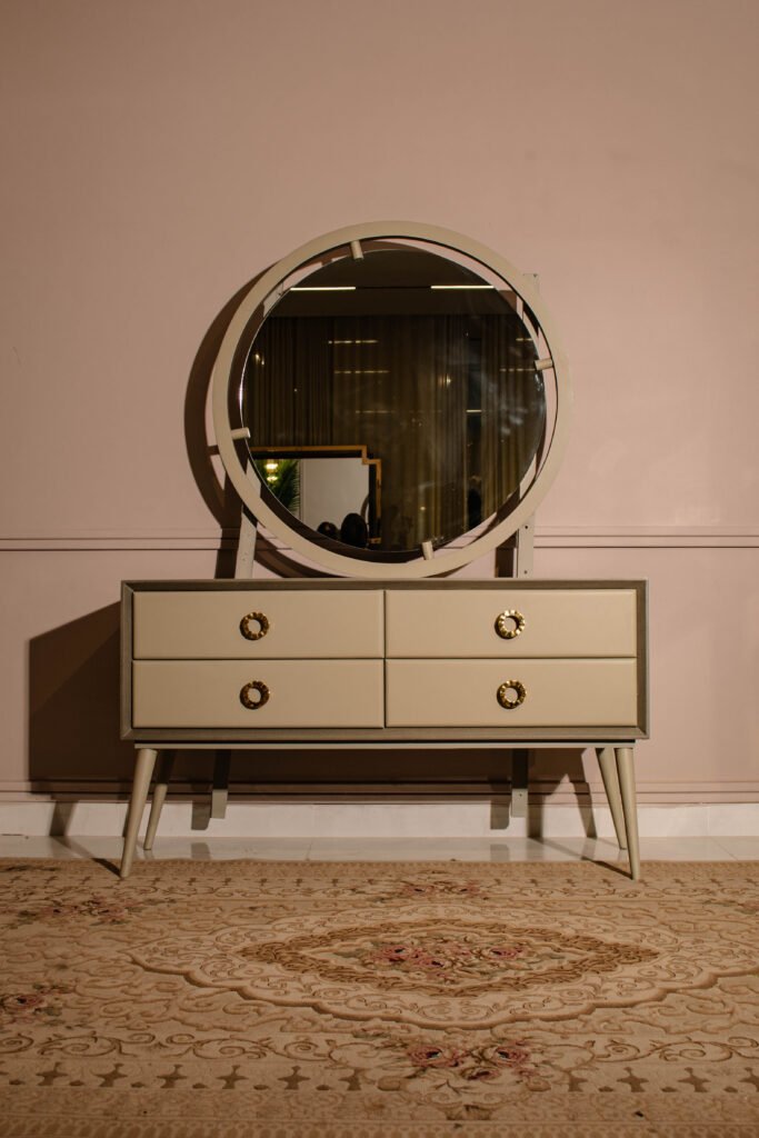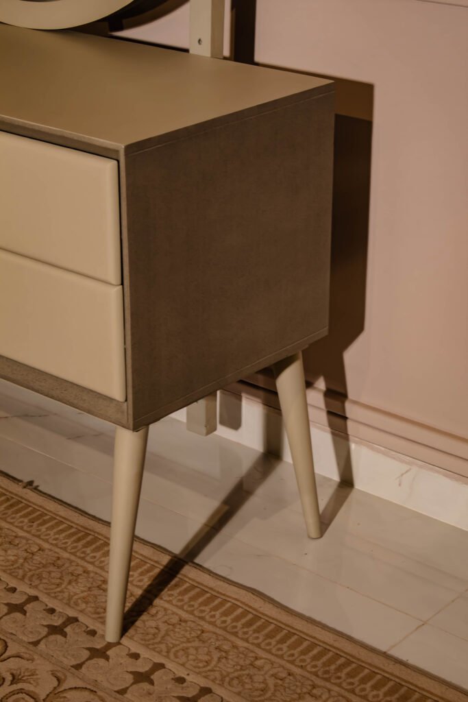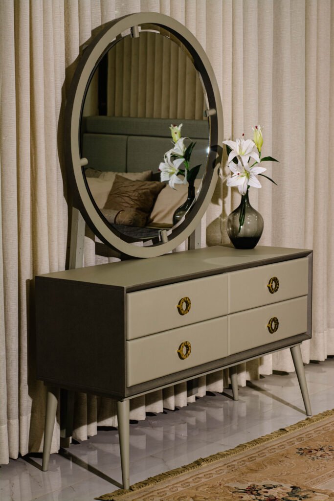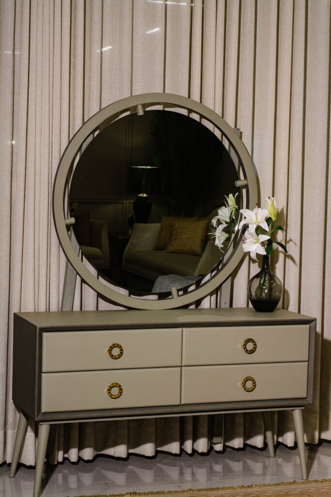 The Serene Dresser & Mirror by Gourmet Furnishers embodies simplicity and calm with its clean lines and soft-toned finish. Designed for modern and minimalist interiors in Pakistan, this set offers functional storage with a tranquil aesthetic.